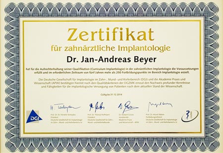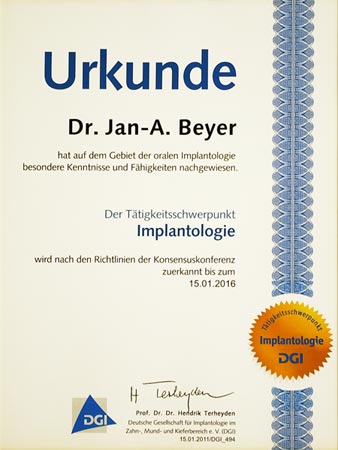 Nach zweijähriger oralchirurgischer Weiterbildung und Prüfung seiner Sachkunde nach zusätzlicher Ausbildung auf dem Gebiet der Implantologie wurde Dr. Jan-Andreas Beyer der Tätigkeitsschwerpunkt Implantologie von der Zahnärztekammer Nordrhein im Jahr 2005 und von der Deutschen Gesellschaft für Implantologie (DGI) im Jahr 2011 anerkannt.